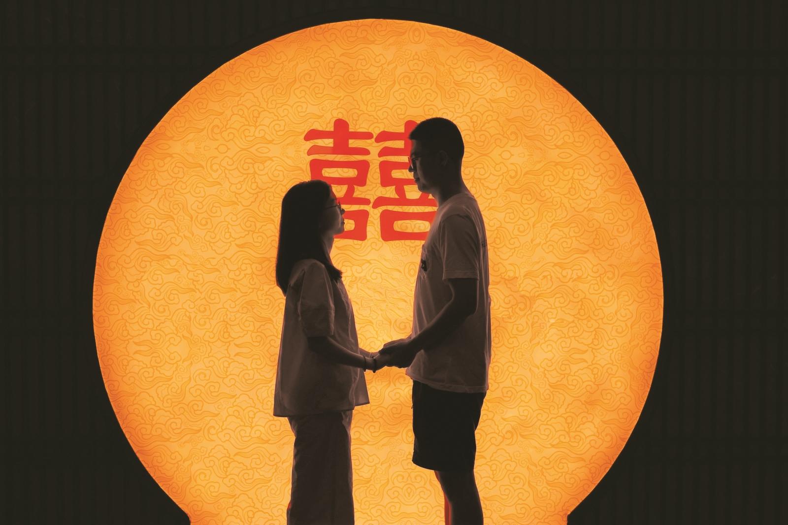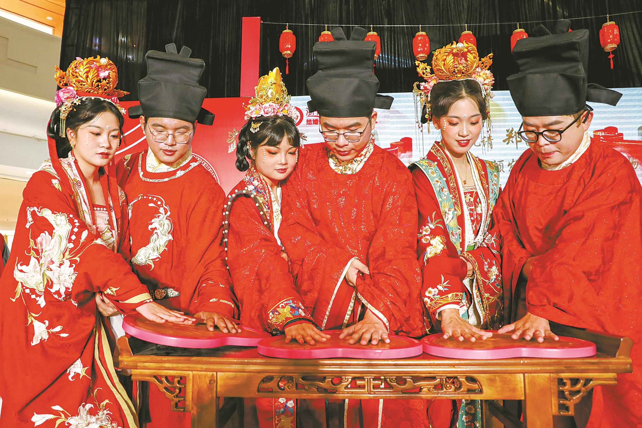 昨天,参加海曙区“鹊梦乞巧·专曙幸福”宋制集体婚礼的新人,在婚俗改革倡议书上按印泥。(张昊桦摄)