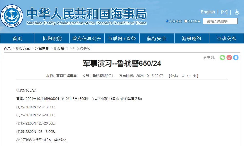 据中国海事局网站消息,董家口海事局发布航行警告,10月16日6时至10月18日18时,黄海部分海域进行军事活动,禁止驶入。