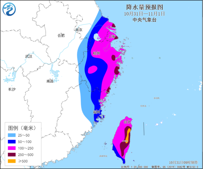 31日至11月1日,台湾岛、福建东北部、浙江中东部、上海、江苏南部等地有暴雨,部分地区大暴雨(累计降雨量100~200毫米),台湾岛东部、福建东北部、浙江东部、上海东南部等地局地有特大暴雨(降雨量250~400毫米,台湾岛东部400~800毫米);最大小时降雨量40~70毫米,台湾岛局地80毫米以上。