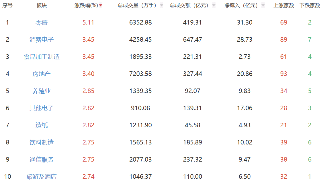 盘面上,零售、消费电子、食品加工制造板块涨幅居前,保险、银行板块跌幅居前。