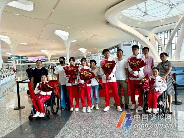 陈懿(左五)、姚攒(右二)跟随其他宁波残奥选手返回浙江。龚旭琪/摄