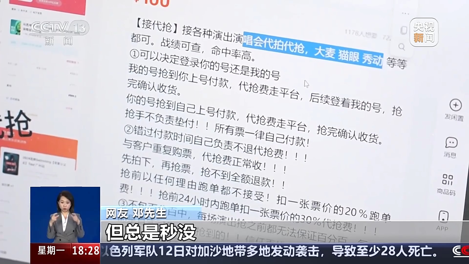网友 邓先生:我一直在官方渠道抢票,但总是秒没。结果我在网上一搜,发现好多“黄牛”在加价卖票,还都说能保证出票。