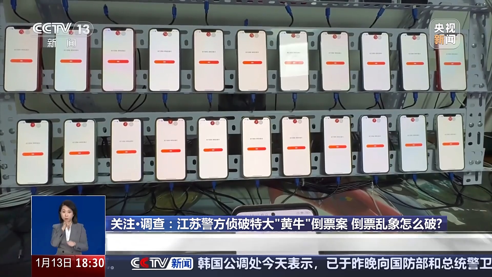 镇江市公安局京口分局网安大队民警 朱澄宇:在“抢手”的一处工作室,我们发现一面“手机墙”,上面放着六七十部手机,每部手机对应一个账号,抢手们就用这些手机中的大量账号抢票。