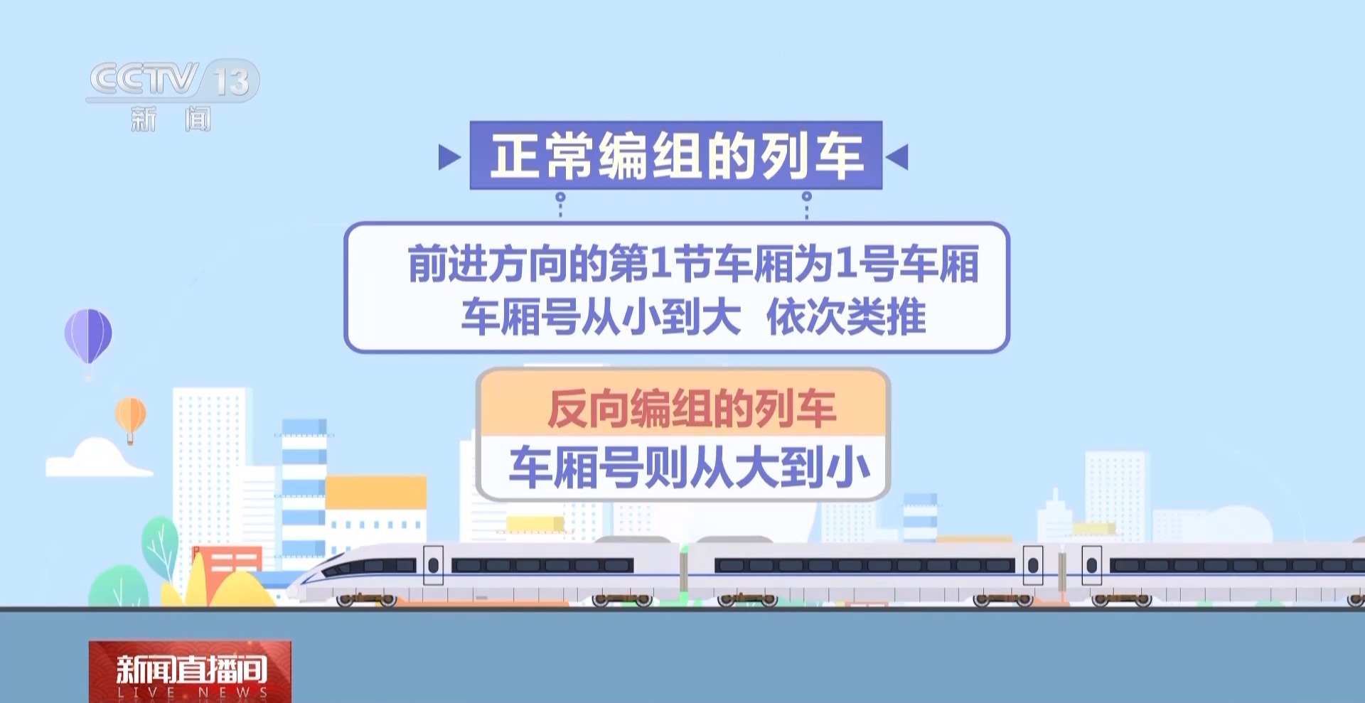 正常编组的列车,前进方向的第1节车厢为1号车厢,车厢号从小到大,依次类推;反向编组的列车,车厢号则从大到小。