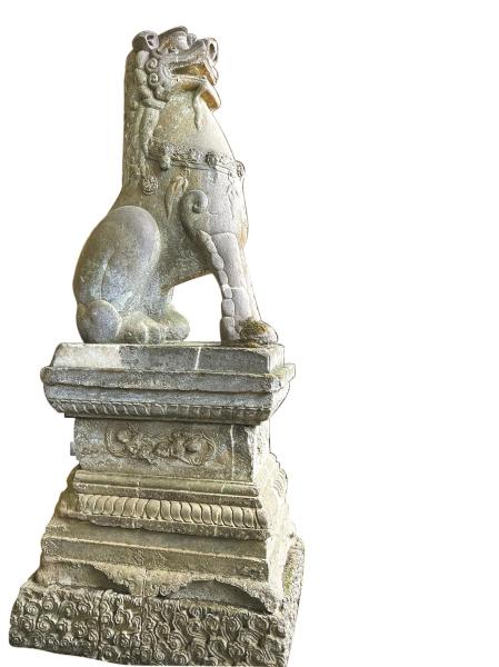 石狮子雄踞在东大寺南大门两侧,“皮肤”呈紫灰色,威严高大,连基座通高3米有余。它面向大佛殿,前肢直立,后肢蹲踞,张嘴扬头,毛发卷曲,胸佩绶带和流苏,装饰简洁精致。石狮台座侧面雕刻的卷云、牡丹、莲花、鹿等精美纹饰,与宁波东钱湖遗存的南宋史氏望族墓道石刻群有异曲同工之妙。