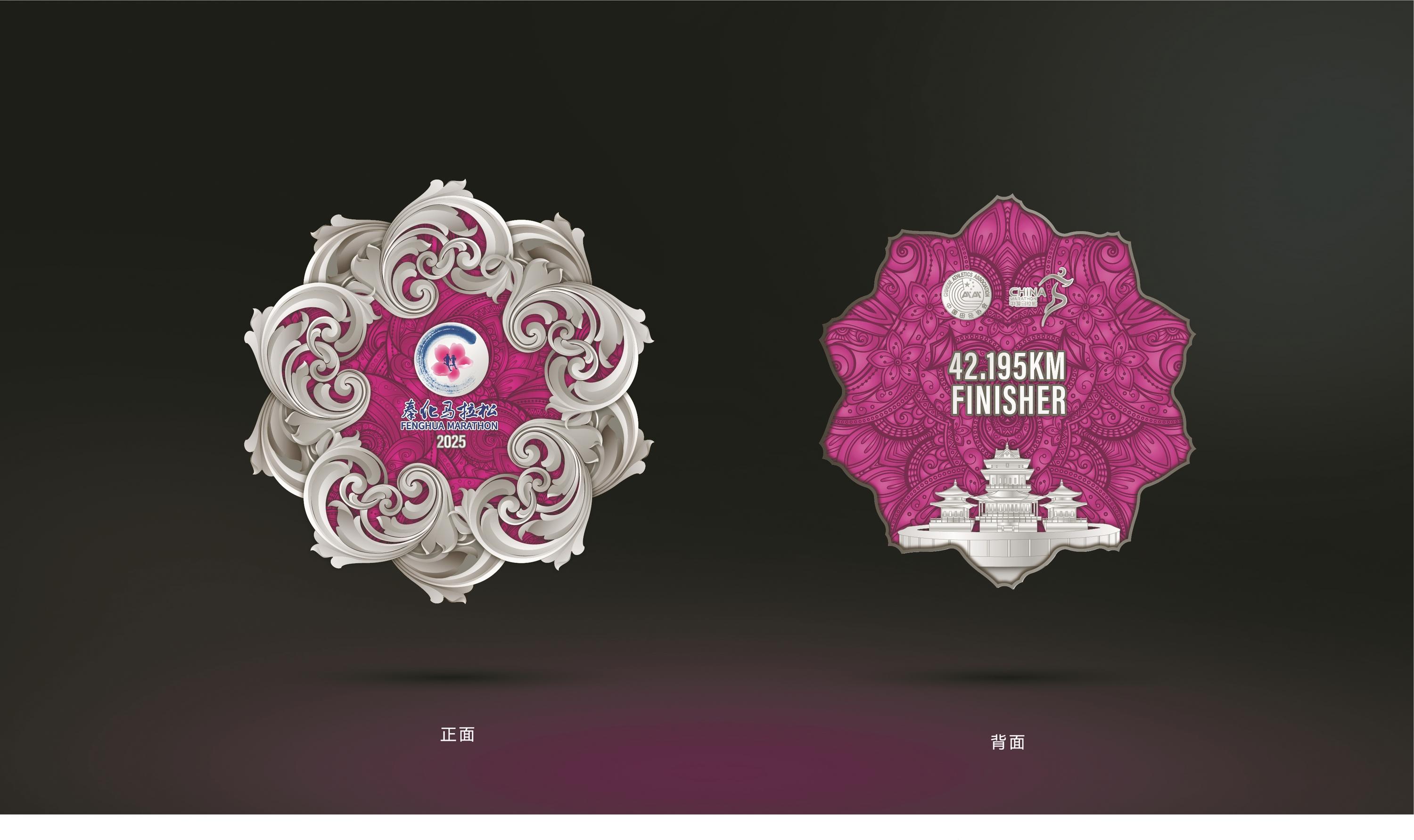 本届赛事的完赛奖牌设计新颖,奖牌外圈由细腻雕琢的纹路形成桃花造型花纹,仿佛春风轻拂,一瓣瓣桃花随风起舞,绽放出春天的生机与希望。翻转奖牌,背面同样引人入胜,延续着正面的自然韵律,以粉色为底,将奉化赛道的壮丽与细腻再度铺展。
