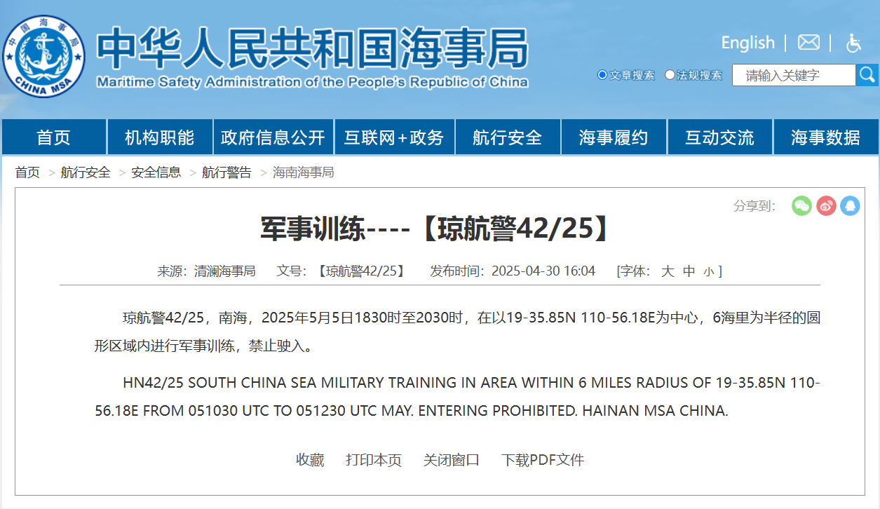 据中国海事局网站消息,清澜海事局发布航行警告,5月5日18时30分至20时30分,南海部分水域进行军事训练,禁止驶入。