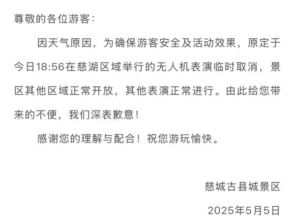 今日(5月5日)下午,慈城古县城景区发布了关于“慈城古县城无人机表演因天气原因临时取消”的通知。