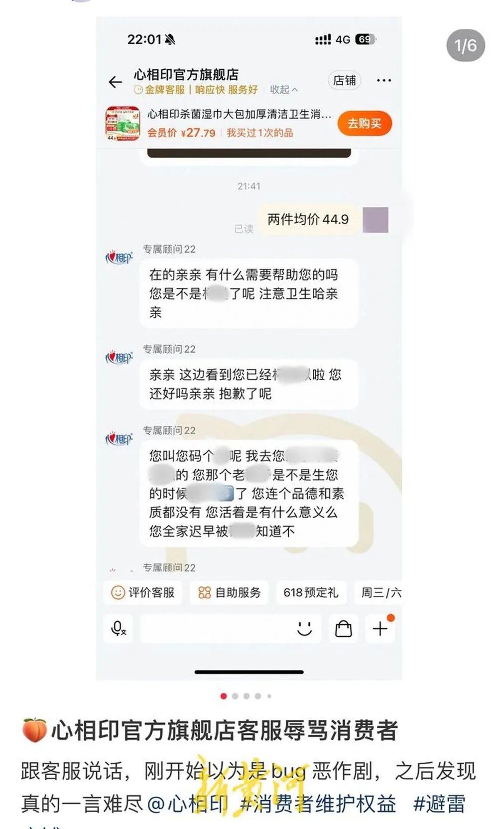 5月8日晚,有河南网友发文称,“去年在心相印买了厨房纸,一直延续到今天才跟客服说话。昨天买的杀菌湿巾,今天点开看主页写着2件均价44.9元,我看到了就去问客服,还没打出来下面的话,专属顾问22号就发来一排信息。我还以为我看错了,就在那里一个字一个字地看,就很疑惑,不理解。”根据该网友截图信息显示,客服向其发送大量侮辱性话语,还表示,“有本事您就去投诉,我们的客服经常这样回复,您要是投诉成功了,我们的店铺是怎么开到现在的,我们的客服就是这么嚣张。”