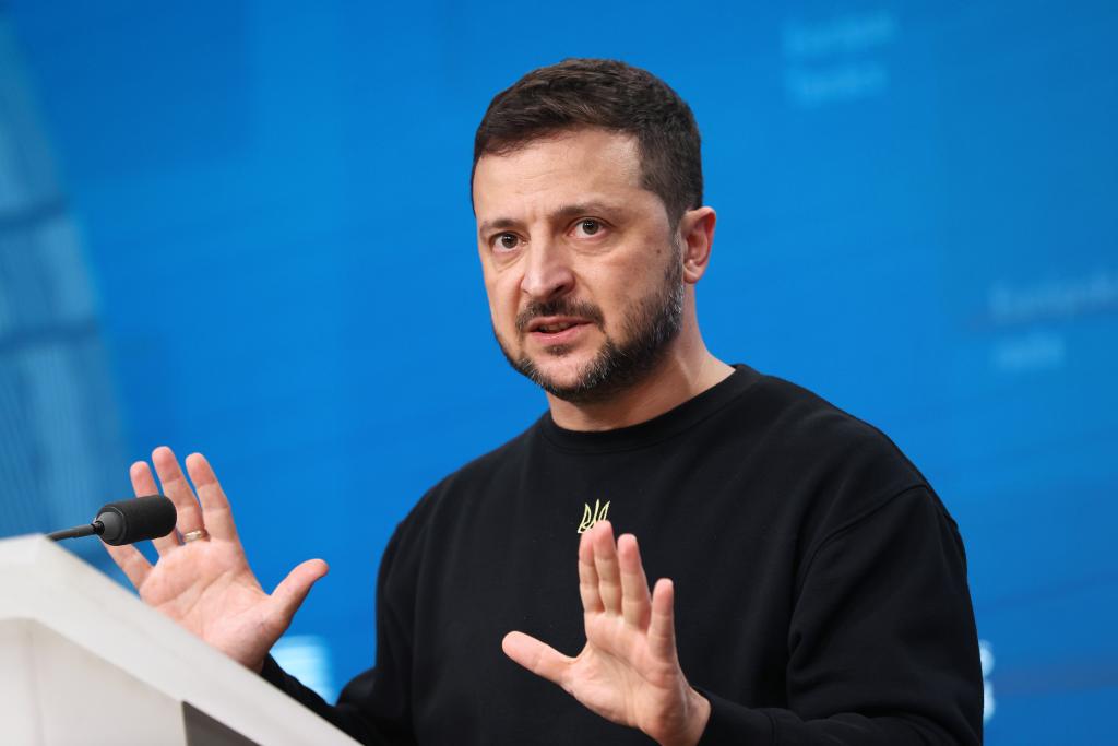 2024年10月17日,在比利时布鲁塞尔,乌克兰总统泽连斯基在欧盟峰会上参加新闻发布会。新华社记者赵丁喆摄
