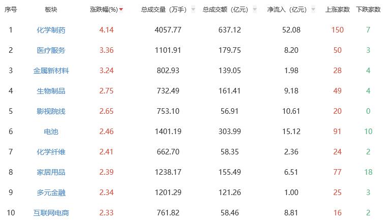 板块方面,化学制药、医疗服务、金属新材料、生物制品等板块涨幅居前,公路铁路运输、贵金属板块下跌。