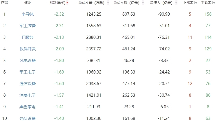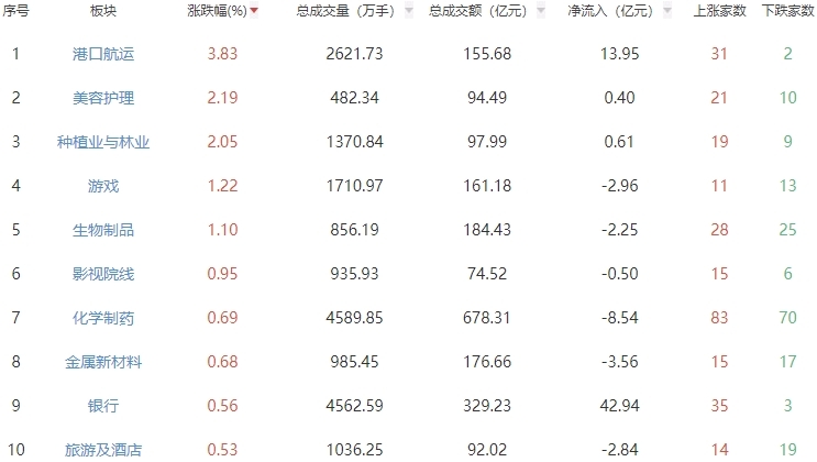 板块方面,港口航运、美容护理、种植业与林业等板块涨幅居前,半导体、军工装备、IT服务等板块跌幅居前。