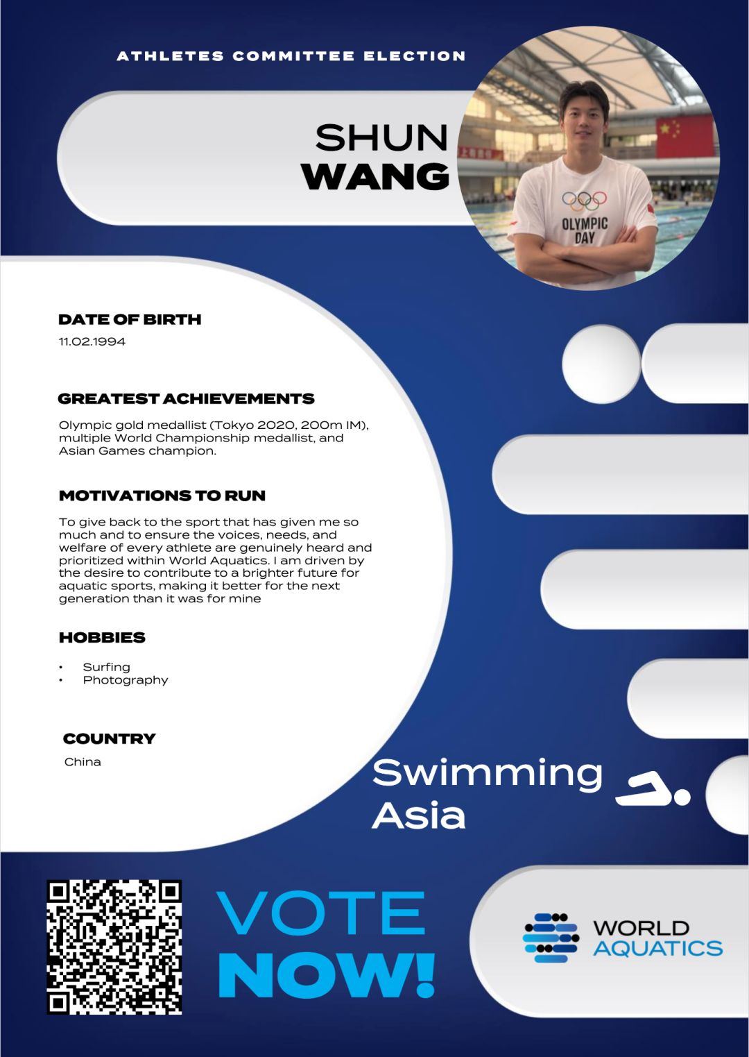 汪顺的竞选宣言是:“希望回馈这项曾给予我诸多的运动,并确保每位运动员的声音、需求和福祉在世界泳联得到真正的倾听和重视。我渴望为水上运动的美好未来贡献力量,让下一代拥有比我这一代更好的发展环境。”
