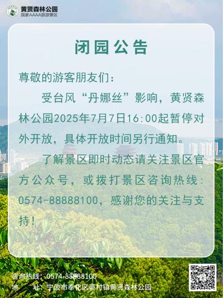 奉化区黄贤森林公园于7月7日16时起暂停对外开放,具体开放时间另行通知。