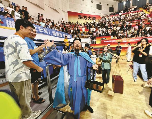 宁海的“徐霞客”和“书童”的扮演者演出前在门口候场时,也一直在手机上关注着比赛直播。“徐霞客”的扮演者林轩宇已是二次登场,宁海队后面的几场比赛的演出嘉宾也是他,真可谓是“铁打的‘徐霞客’和流水的‘书童’‘家丁’”。此次,他们为现场观众送上了特色“侠客饼”,也就是麦饼,有甜、咸两种口味。