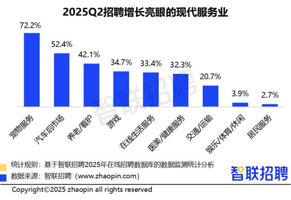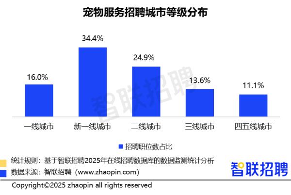 据智联招聘近日发布的《2025年二季度人才市场热点快报》显示,在今年第二季度中,宠物服务行业招聘职位数以72.2%的增速位居所有服务行业之首。而从城市类型来看,新一线城市对宠物服务行业人才需求最旺,以34.4%的占比领跑榜单。
