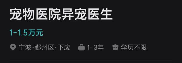 宁波对宠物行业人才的需求如何?在BOSS直聘等招聘平台上输入“宠物”二字,记者发现搜索结果达上百个,岗位薪资多在5000元至8000元之间,而异宠医生等岗位的月薪最高可达1.5万元。此外,在前不久海曙区举办的拓岗研学活动中,为招聘宠物药品研发人才,宁波三生生物科技股份有限公司还专门前来宣讲。