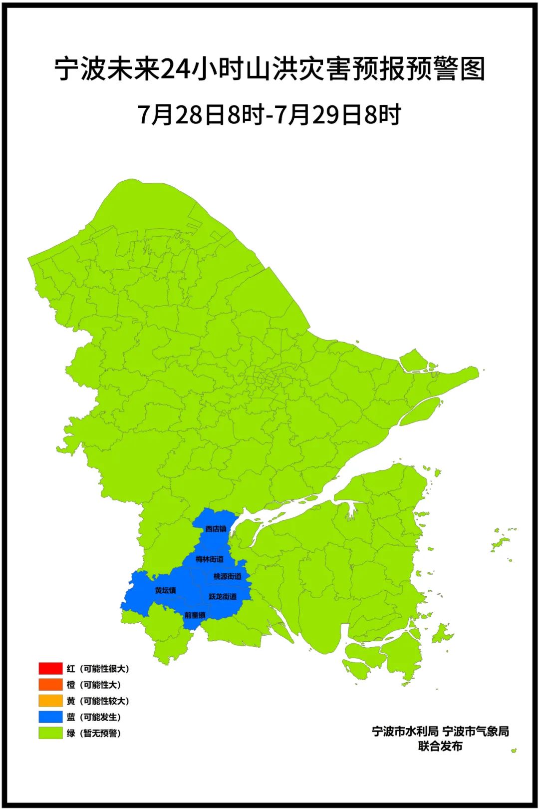 宁波市水利局、宁波市气象局2025年7月28日10时联合发布山洪灾害蓝色预警,预计7月28日8时-7月29日8时,我市宁海县梅林街道、跃龙街道、桃源街道、前童镇、黄坛镇、西店镇山洪灾害预警等级蓝色,可能发生山洪灾害(Ⅳ级)。请公众注意防范山洪风险。