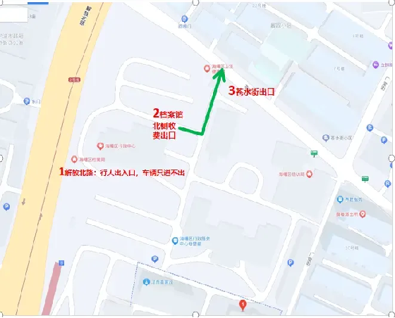 二、车辆通过智能道闸完成车牌识别后可进出停车场,入口为海曙区档案馆西门,出口为区行政中心北门;行人统一从档案馆西门进出。