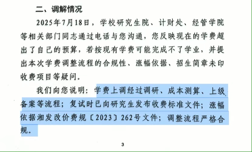 2025年7月11日,学生们向湖南省信访局反映问题。7月18日,他们收到了校方回应。中南林业科技大学表示,学费上调经过调研、成本测算和上级备案等流程,且涨幅依据“湘发改价费规〔2023〕262号”文件,调整流程严格合规。