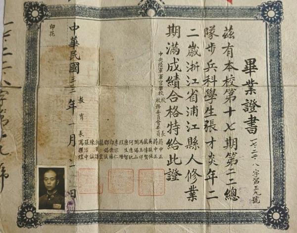 张才炎的名字再一次出现,是在1943年黄埔军校第十七期第二十二总队步兵科的毕业证书上。之后,他奔赴战场,受过伤,留过血,也立过功,升过职。