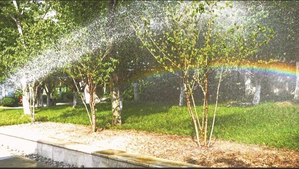 “主要是天气太热了,水喷出去再加上光的折射,自然就形成了彩虹。”负责鄞州公园二期绿化养护的宁波市天莱园林建设工程有限公司项目部经理李洋波说。
