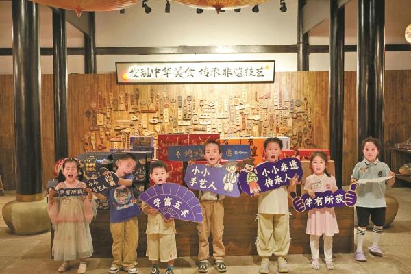 小朋友在镇海三关六码头“手艺人部落”体验非遗技艺。