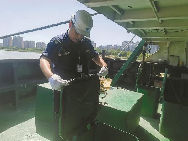 这次的目的地是一条渣土运输船舶。登上船后,宋化龙先钻入机舱,仔细检查机器的使用状况是否正常,油路、管路是否完好,油抹布及废油易燃品是否及时清除。当宋化龙从船舶机舱里爬上来的时候,早已满头大汗,全身湿透,像从水里捞出来一样。这是近日海事执法人员高温“烤”验下的一个缩影。