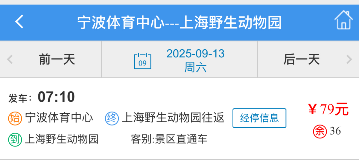上海野生动物园直通车(9月13日、14日发班)时刻为: