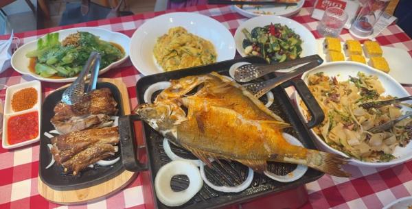 记者点了西贝面筋、胡麻油调黄瓜、黄米凉糕、草原嫩烤羊排、一把羊肉串配现烤馕、胡麻油沙葱炒鸡蛋、鸡汤白玉山药炖豆腐、葱油罗马生菜、五种番茄酸汤莜面鱼鱼、葱香烤鱼,共计10道菜(备注:另有3道罗永浩点的菜品,店内无供应)。