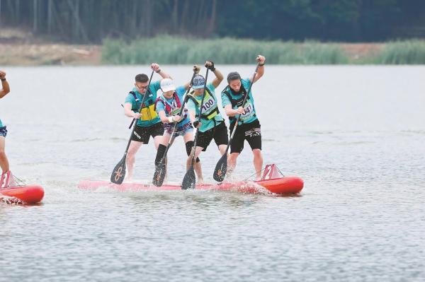 发令枪响,选手们如离弦之箭划破湖面。一块块色彩斑斓的桨板在阳光下格外醒目,选手们躬身挥桨、全力冲刺,动作流畅而有力。湖岸两侧,观众的呐喊助威声此起彼伏,与古镇的白墙黛瓦、远山碧水交织成一幅动感十足的现代风景画。