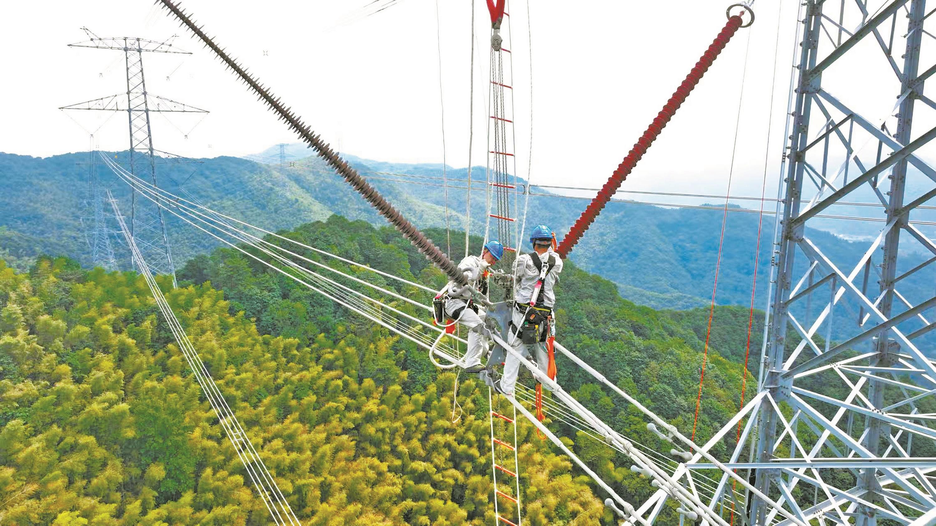 前日,在余姚市湖东村桃花岭山头,经过4个多小时的高空连续作业,国网宁波供电公司输电运检人员成功完成对500千伏春州5884线98号塔三相绝缘子的更换工作,进一步增强宁波电网在节假日的供电可靠性。