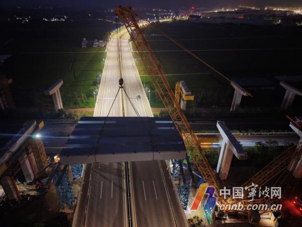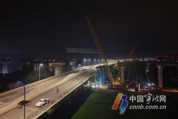 9月30日凌晨5点,经过两个昼夜的攻坚,一片长35米、吊装半径达40米、重量近百吨的钢箱梁,在精准起吊、平稳转体和缓慢落位后,顺利完成上跨金海路架梁施工,为鄞奉高架桥后续梁板安装形成连续作业面奠定了坚实基础。