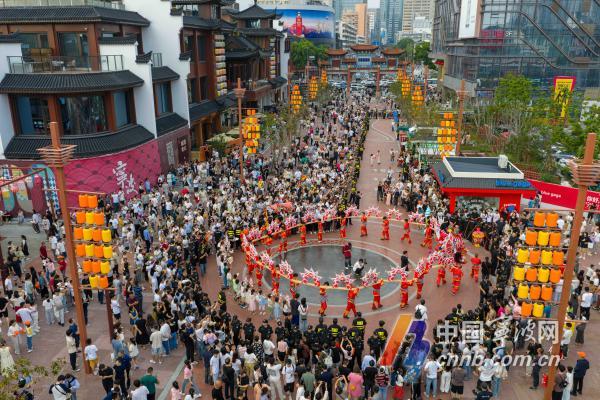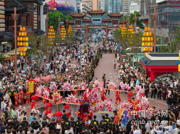 在城隍庙步行街上,一场板龙巡游正在上演,吸引大量市民游客驻足观看。在国庆假期期间,步行街上日日有演出,海曙、宁海等地的非遗表演也将一一呈现,既烘托节日气氛,也向来甬的游客展现宁波深厚的文化底蕴。