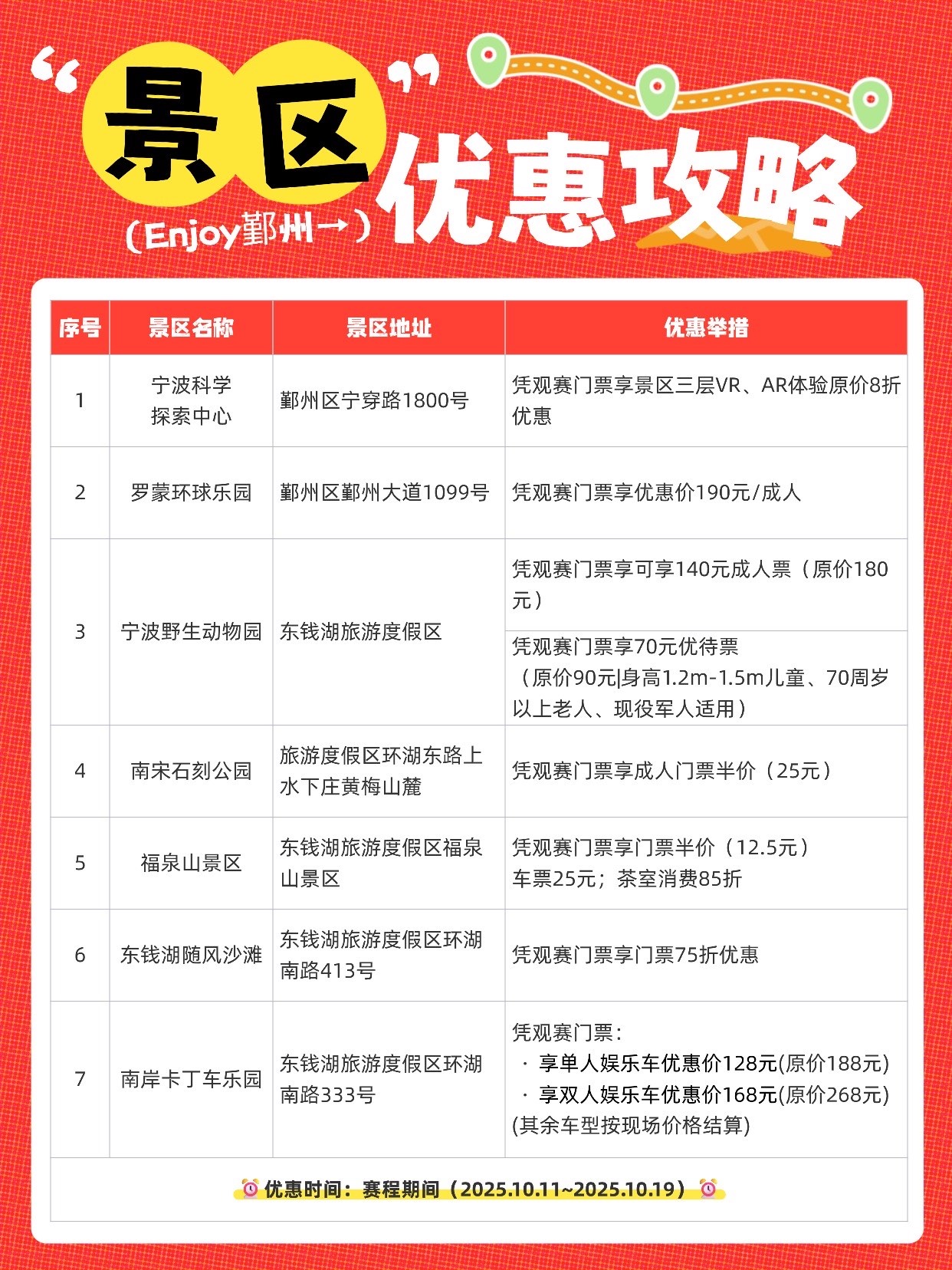 凭观赛门票,直接解锁宁波热门景区折扣,搞定你的观赛休闲时光,不管是带娃探索科学馆、去乐园疯玩还是到动物园、自然景区吸氧,都有专属福利等你。