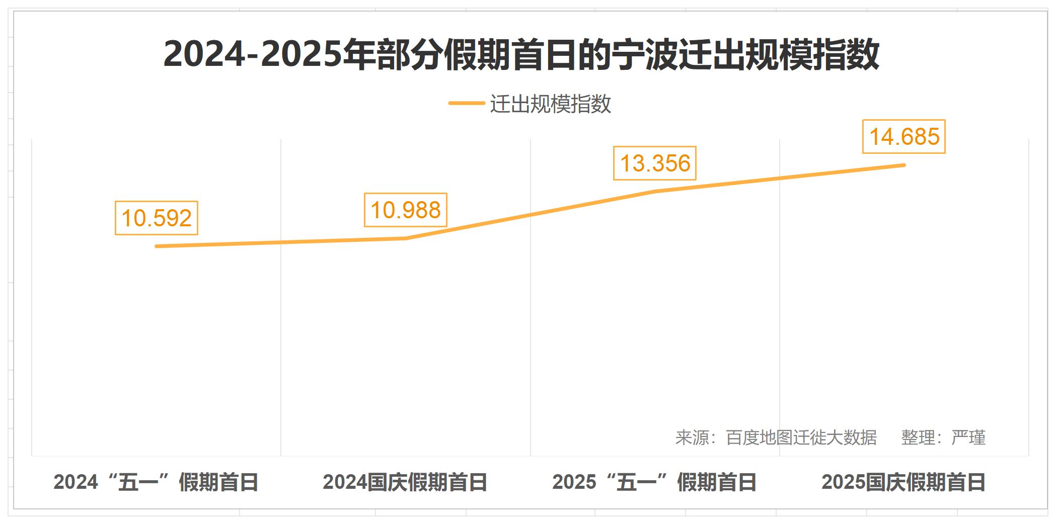 百度地图迁徙大数据显示,2023年、2024年、2025年的国庆假期首日,宁波的迁出规模指数,都较上一年有所攀升,不断刷新2020年以来的纪录。