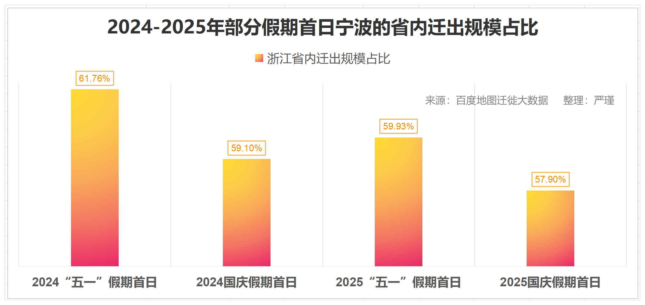 但今年“省外游”的占比略有上升。无论是“五一”假期首日(59.93%)还是国庆假期首日(57.90%),宁波居民的省内迁出规模占比均低于去年同期,分别低1.83个百分点和1.2个百分点。