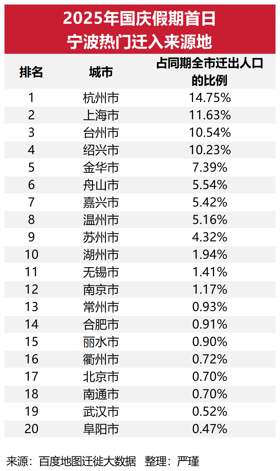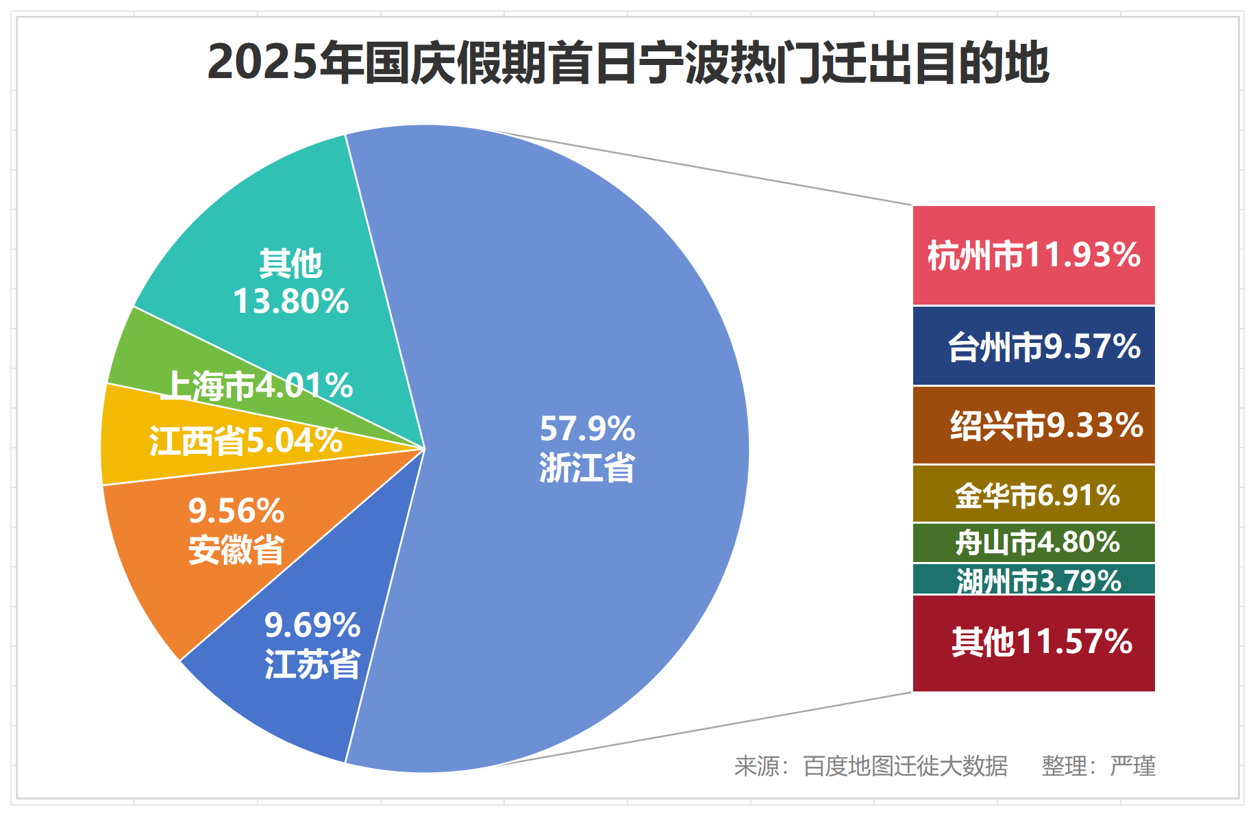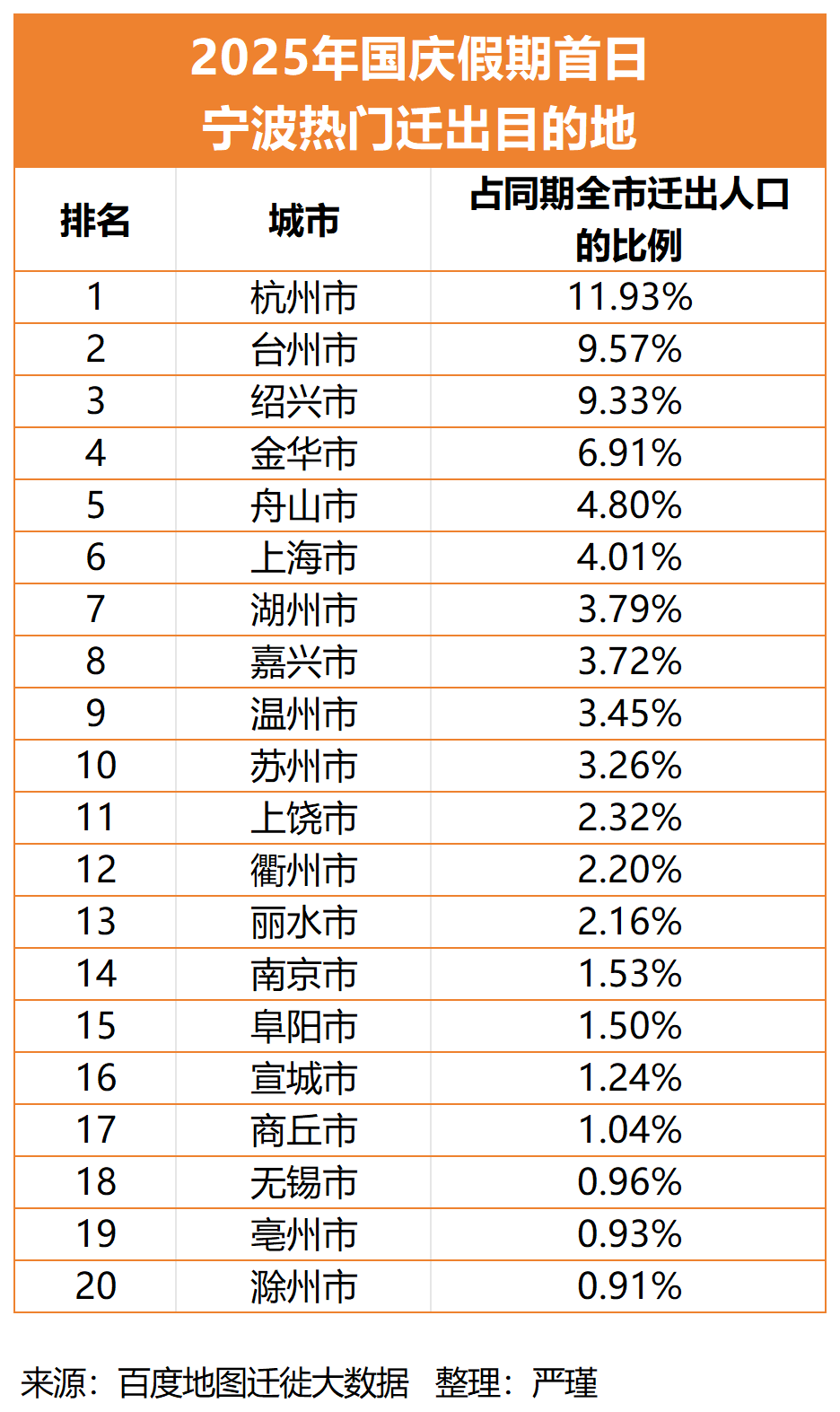 从城市分布看,和去年一样,杭州市(11.93%)、台州市(9.57%)和绍兴市(9.33%)仍是2025国庆假期首日宁波最热门的迁出目的地,三者合计占比达30.83%,即当天每5个离开宁波的人就有3人前往这些兄弟城市。