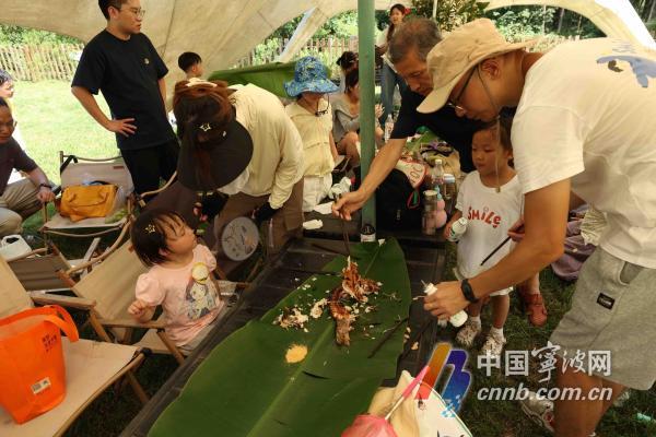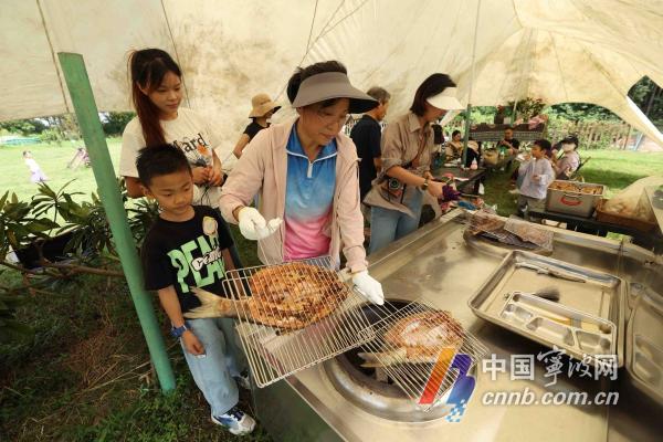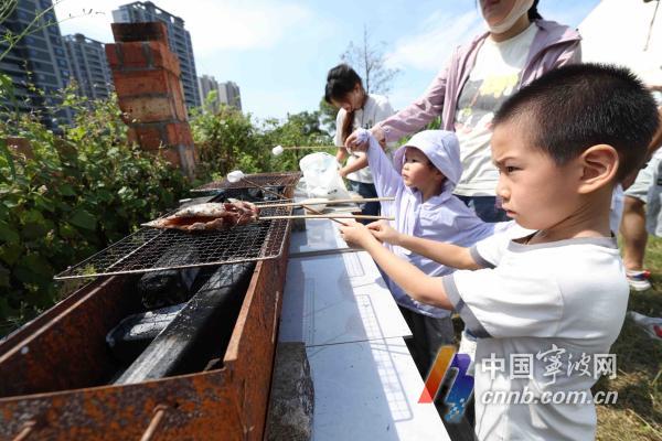 市民正在镇海骆驼街道一农庄体验烤鱼。