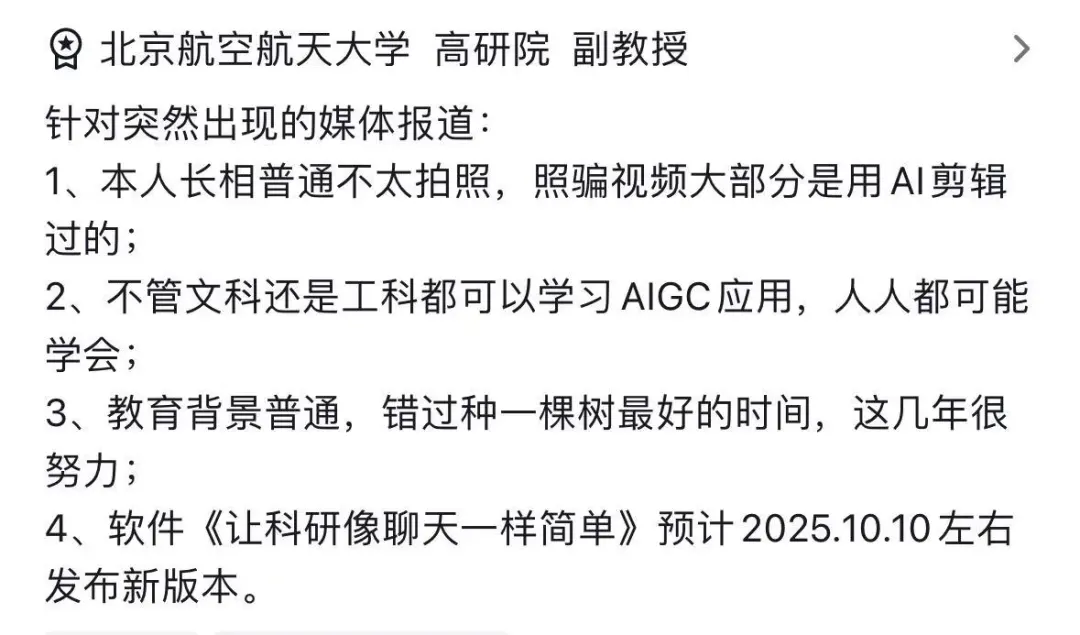 近日,北京航空航天大学一名90后女副教授,在短视频平台讲述生成式人工智能的授课视频引发关注。10月1日,北京航空航天大学高等研究院工作人员回应称何静确实是他们学院的老师。