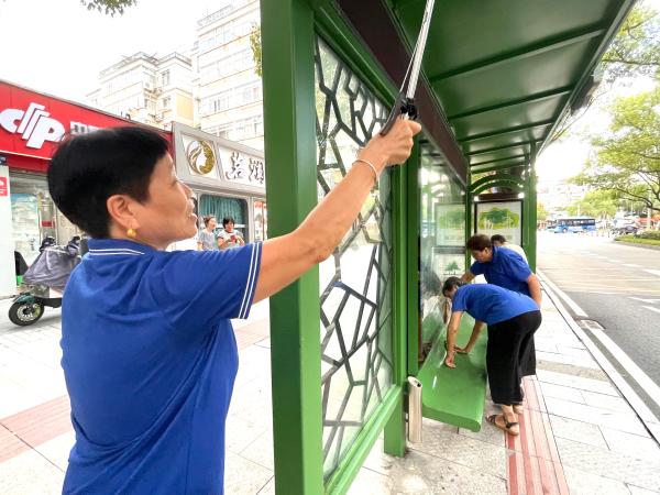 在小区东门公交站台,我和朱丽芬等人熟练地洗抹布、擦站牌。正擦着,环卫工侍师傅推着三轮车走了过来,笑着冲我喊:“李大姐,辛苦了!”