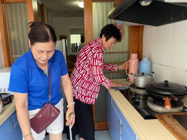 方秋菊(左一)陪着朱佩云(右一)唠家常。