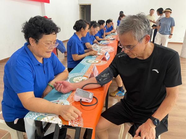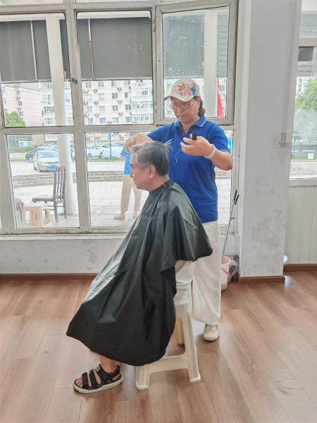 我和几个姐妹在社区活动室摆开桌子、铺上红布,为居民提供公益理发、缝补衣裤、量血压、测血糖、修指甲等服务。