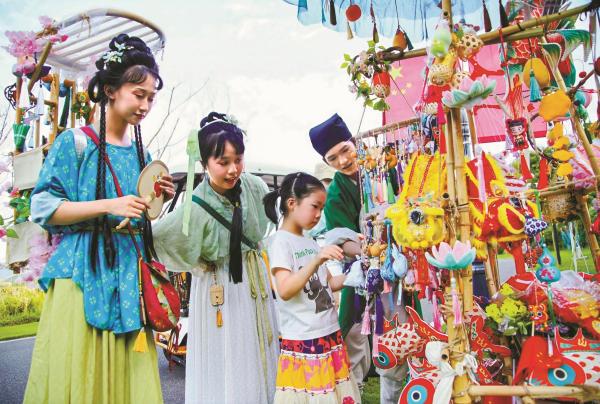 一名小游客在“宋代货郎”的货架前挑选国风文创产品。