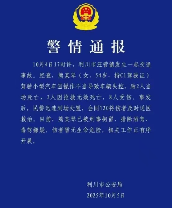 10月5日,湖北利川市公安局通报,利川市汪营镇发生一起交通事故。经查,熊某琴(女,54岁)驾车因操作不当导致车辆失控,致5人死亡,8人受伤。熊某琴已被刑事拘留。