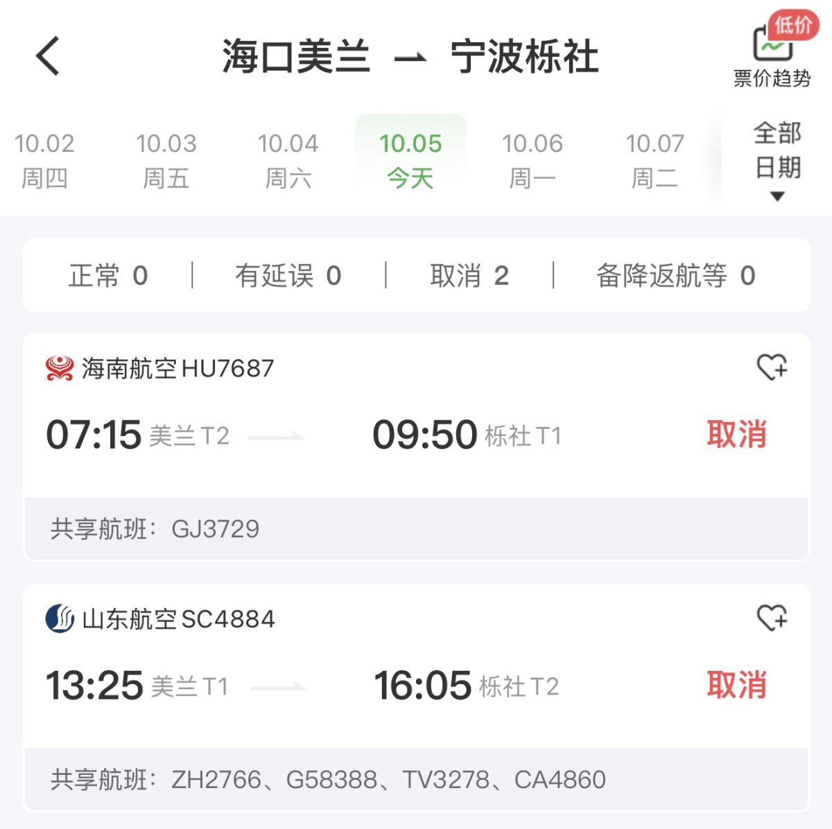 受此影响,10月5日全天,海口美兰机场飞往宁波栎社机场的山东航空SC4884、海南航空HU7687共2趟航班全部取消。