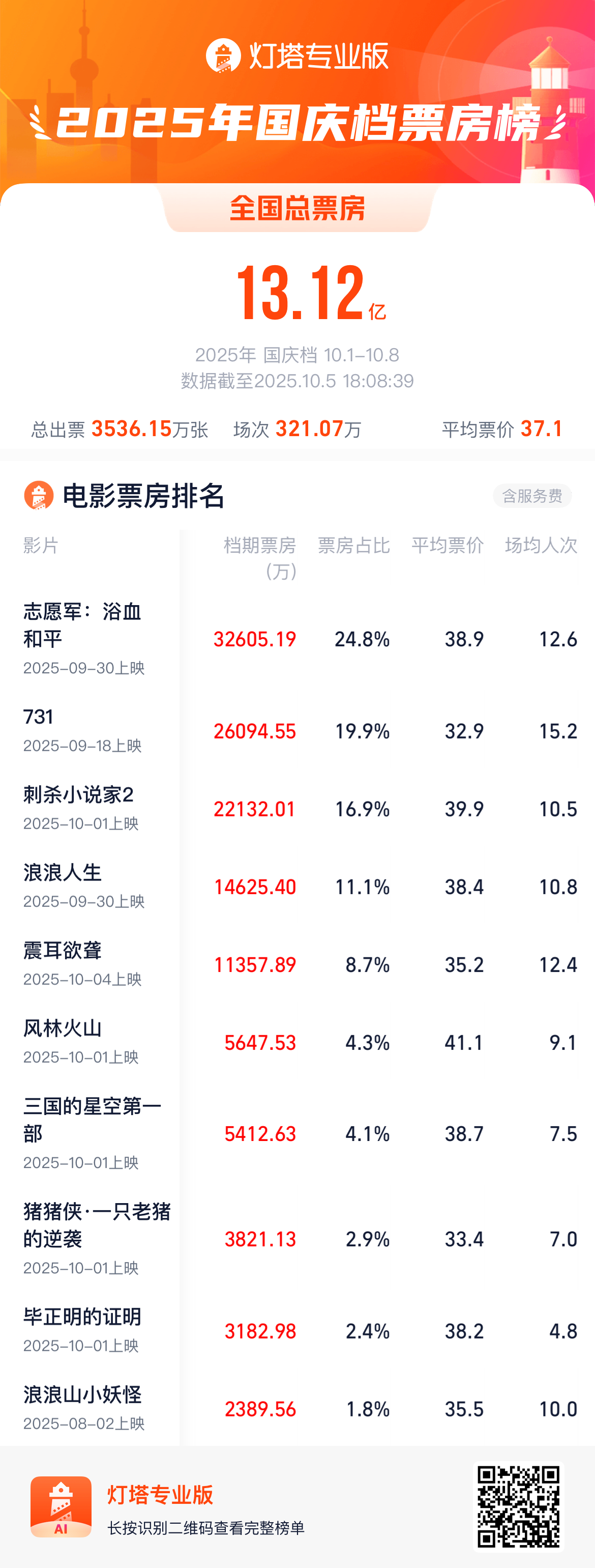 根据灯塔专业版数据,截至10月5日17时16分,2025年国庆档票房(含预售)突破13亿元。《志愿军:浴血和平》《731》《刺杀小说家2》《浪浪人生》《震耳欲聋》暂列票房前五名,且各片档期票房均突破1亿元。截止记者18时08分发稿时,档期票房达13.12亿。