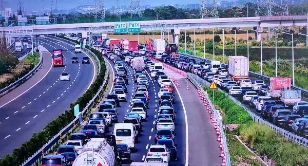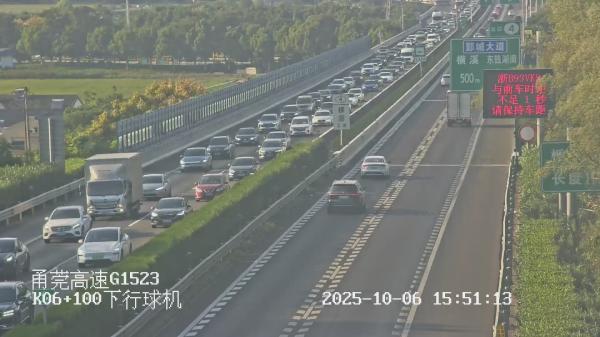 下午,情况基本类似。直到下午3点,预警路段增多:杭甬高速、绕城高速、甬金高速部分路段出现大流量。尤其是甬莞高速有收费站临时关闭,充分说明返程高峰已至。