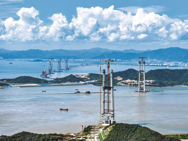 近日,双屿门特大桥——这座世界最大跨度跨海桥梁的两座索塔双双封顶,为后续上部结构施工、主缆架设、钢箱梁吊装等奠定了坚实基础。(甬派客户端宁波日报 唐严 姚峰 摄)
