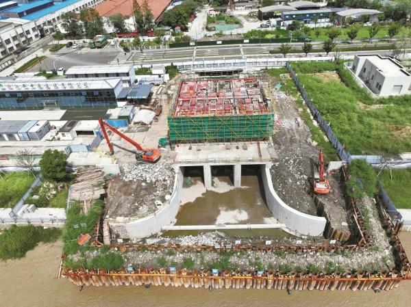 假日期间,在江北区双桥泵站、姚江倪家堰段堤防等水利工程现场,机器轰鸣、焊花飞溅。在双桥泵站及联通河道工程现场,近20名来自安徽、贵州、四川等地的建设工人正紧张作业,图为该项目施工现场。(甬派客户端宁波日报 陈结生 方舟 摄)